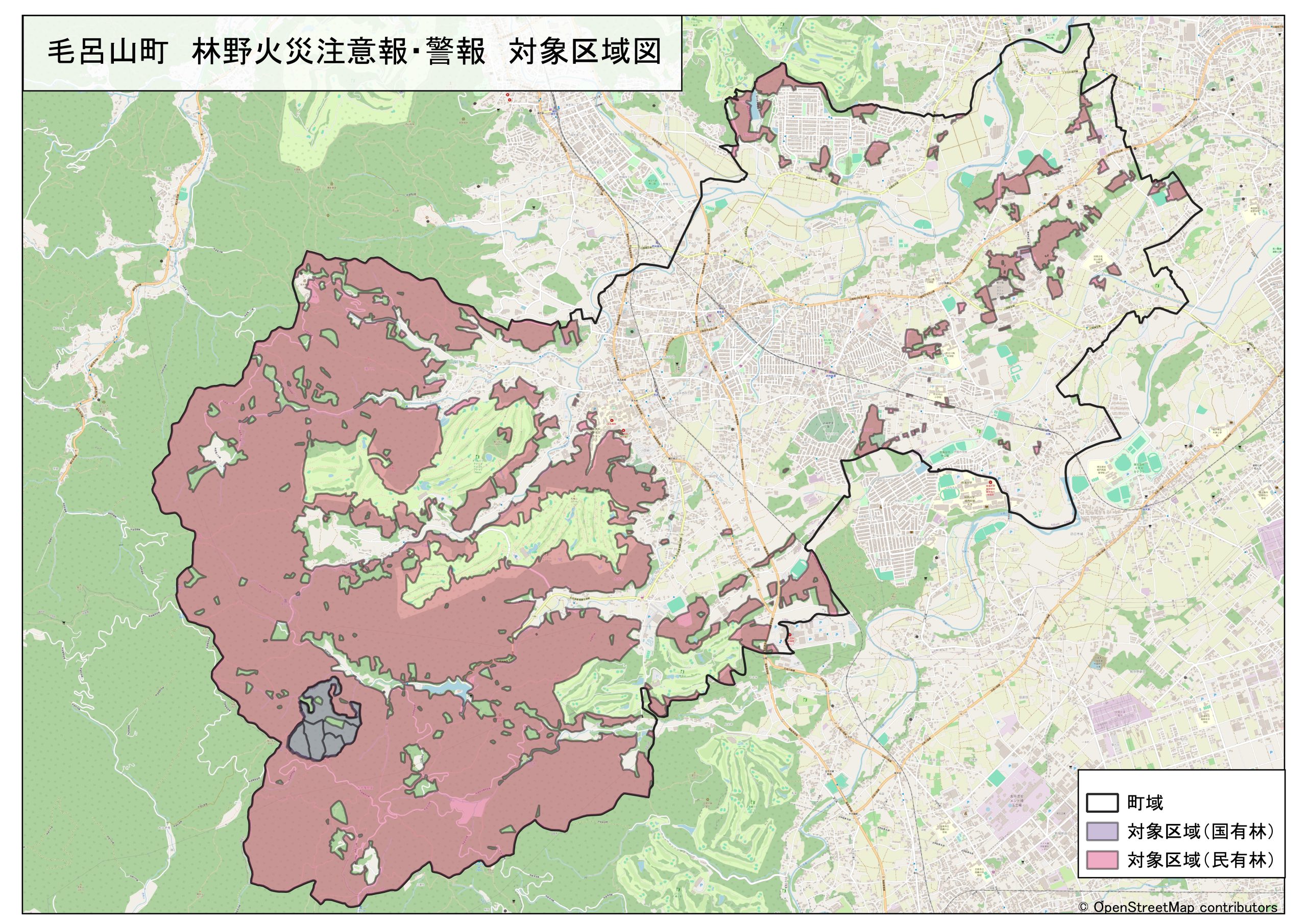 西入間広域消防組合では令和8年3月31日から、管内で林野火災を防止するため、注意を要する気象条件となった場合には「林野火災注意報」を発令します。また、林野火災注意報が発令され、かつ、強風注意報が発表された場合には、火災の危険性が高まることから「林野火災警報」を発令します。毛呂山町・鳩山町・越生町の対象区域では、林野火災注意報発令時には、火の使用を避けていただき林野火災警報発令時には、火の使用が制限されます
